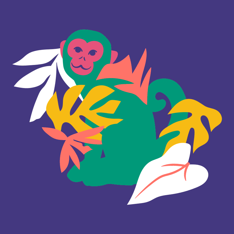 Mezclao Studio illustration featuring vibrant rainforest animals in a tropical setting.